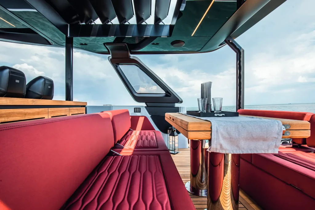 Sia sotto coperta che nel pozzetto, numerose soluzioni facilitano la connessione ai dispositivi elettronici: prese USB a tenuta stagna, caricabatterie wireless universali per smartphone e sistemi audio e di intrattenimento gestibili da qualsiasi posizione, evidenziano l’attenzione al comfort tecnologico.
