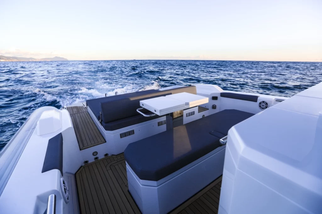 Gli esterni del Pirelli 42 sono caratterizzati da linee aerodinamiche e da una carena con doppio redan che garantisce prestazioni superiori anche in condizioni difficili. La prua offre un’ampia area prendisole ideale per il relax, mentre il pozzetto attrezzato secondo le esigenze dell’armatore accoglie gli ospiti in comodità. Ogni dettaglio esterno è stato deciso con cura per esaltare lo stile inconfondibile dei Pirelli Speedboats, combinando estetica e funzionalità in un design che non passa inosservato. La stabilità durante la navigazione è assicurata grazie alle soluzioni tecniche innovative che rendono questo maxi rib sicuro e stabile anche alle alte velocità.