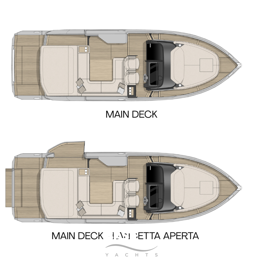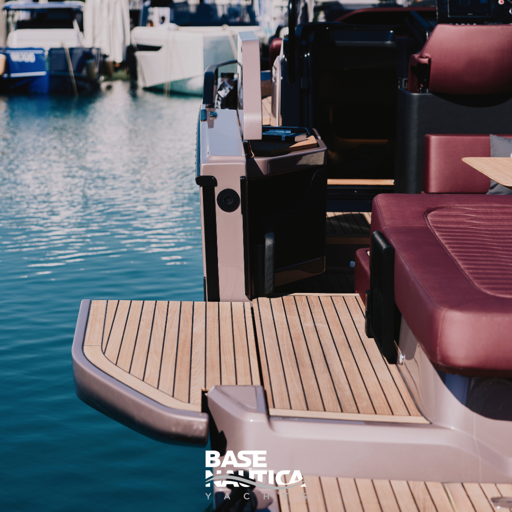 Dispone di una zona di prua comoda e godibile, un pozzetto con ampie sedute per chi si accomoda nella dinette, poltrone comode per il pilota e il copilota, e, soprattutto, a poppa una vera e propria area beach, che si ricava abbattendo la murata laterale. Un’oasi sospesa sull’acqua.
