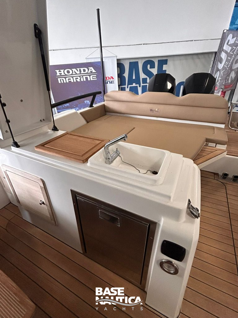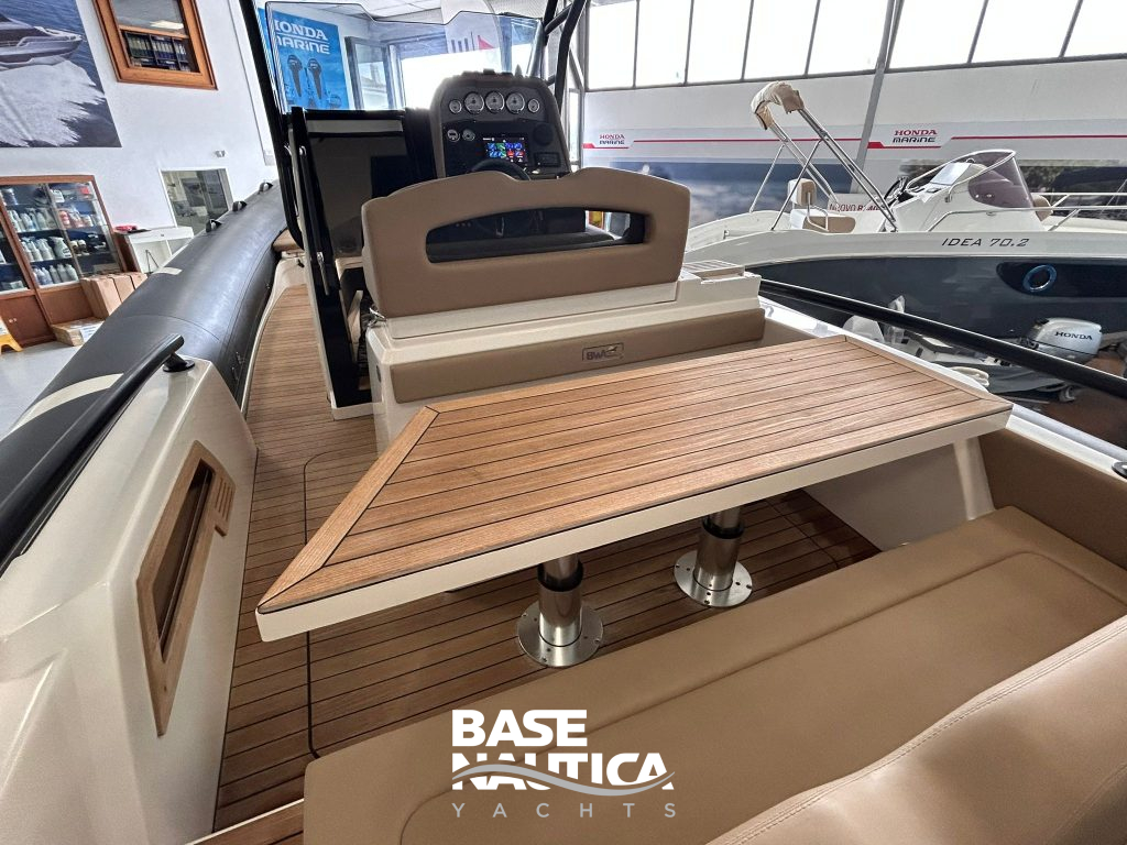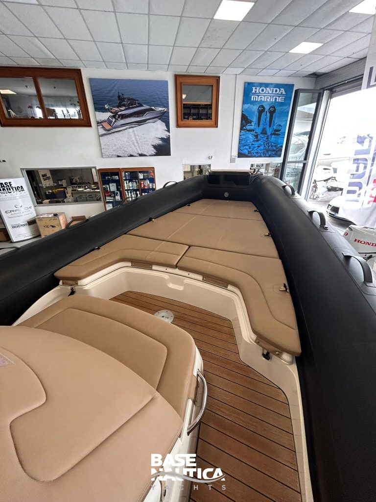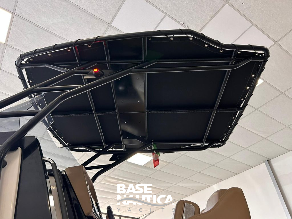 T-top nero originale BWA, tavolo elettrico pozzetto trasformabile in prendisole, wc elettrico, cabina 2 posti letto, teak completo, strumentazione Raymarine axiom, tessuto tubolari Carbon Black e tappezzeria beige silvertex, conta metri verricello elettrico, frigorifero elettrico