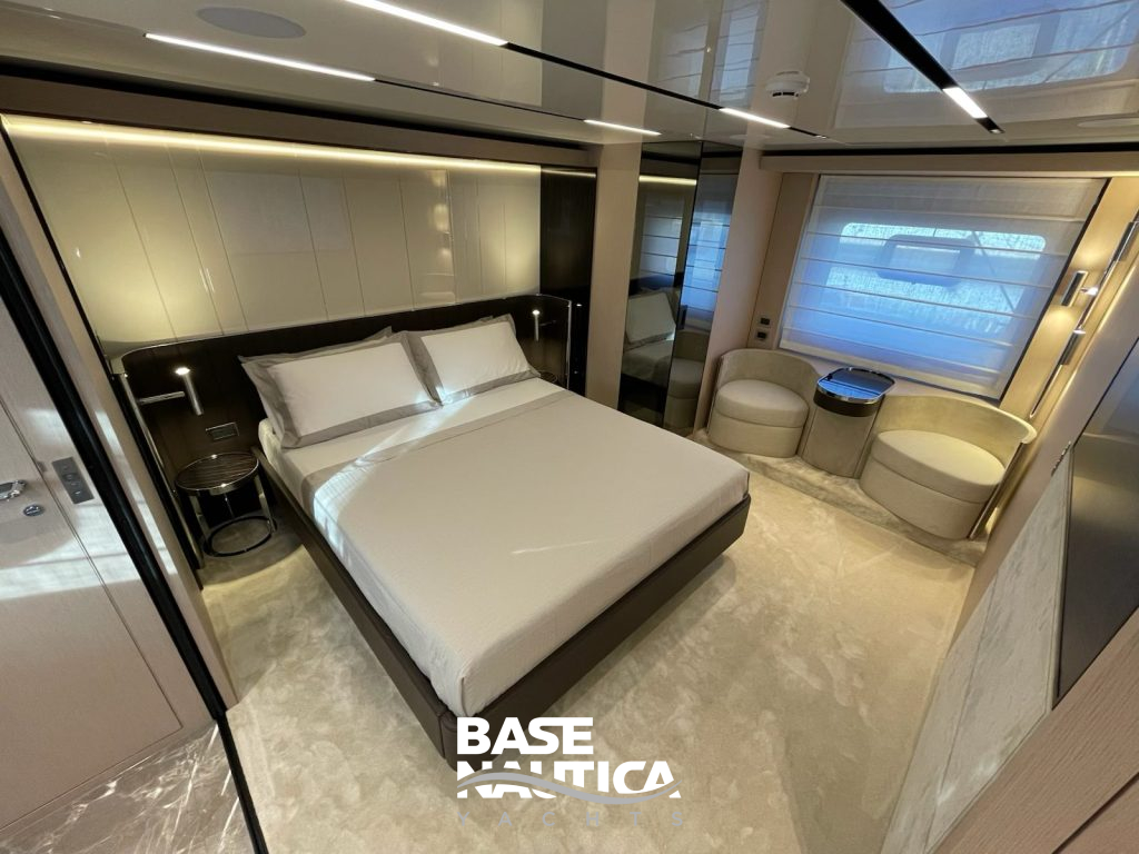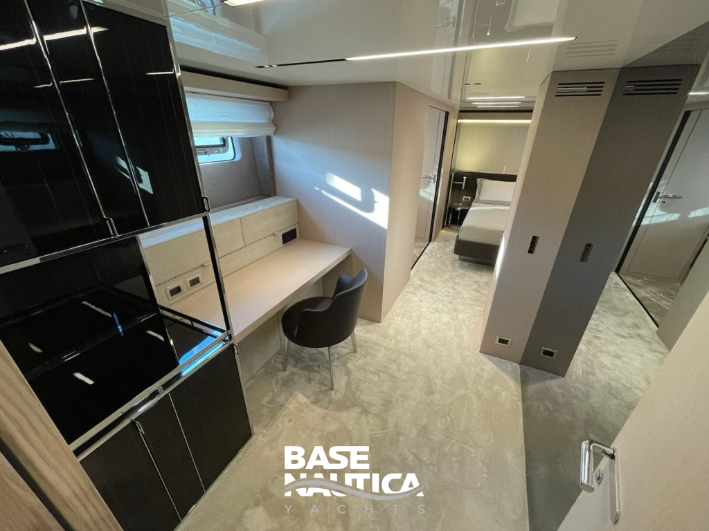Anche sottocoperta, superfici e volumi sembrano dilatarsi, in modo particolare nell’alloggio dell’armatore a tutto baglio. Il tono di calda e rilassata eleganza che si respira negli interni è amplificata anche dalle preziose scelte di décor.