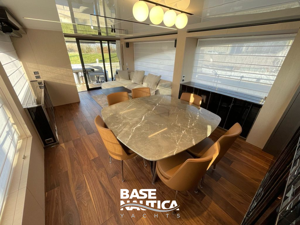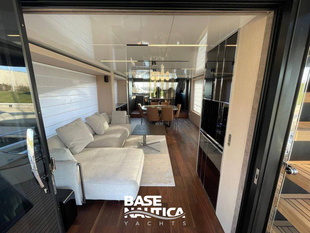Gli spazi del salone si estendono fino a comprendere anche la cucina e il locale di timoneria in una sorta di open space multifunzionale, che è però elegantemente diaframmato da una quinta scenografica che separa l’area lounge e la sala da pranzo dagli ambienti di servizio.
