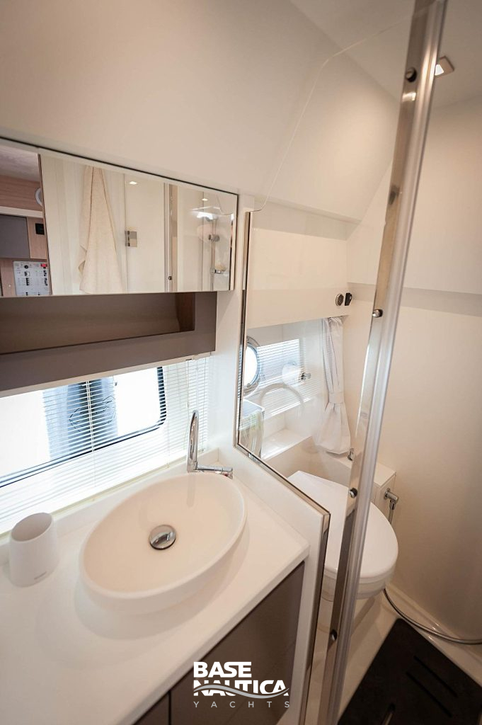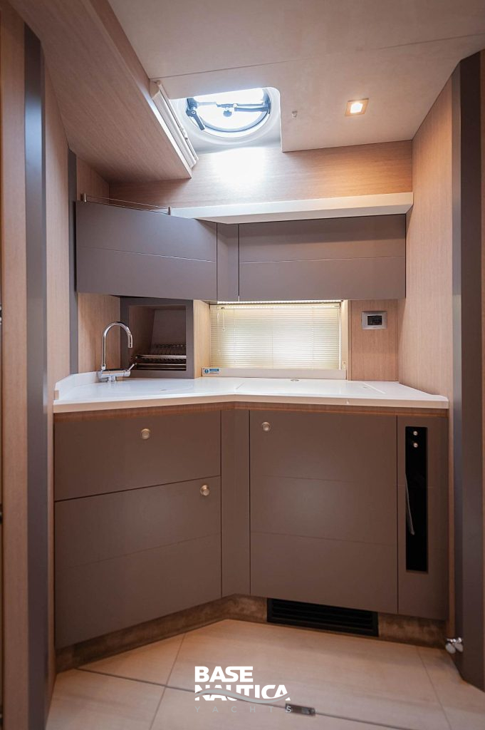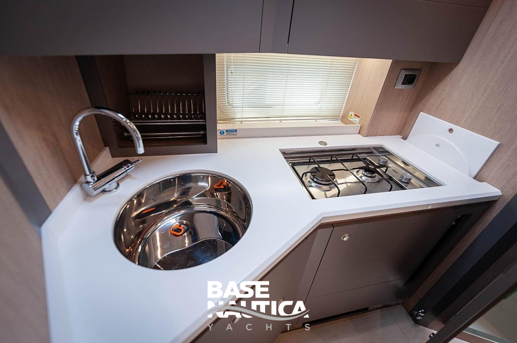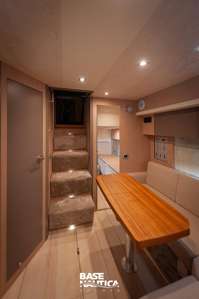 CABINA ARMATORIALE A PRUA, CABINA OSPITI DOPPIA A POPPA, AMPIO BAGNO CON BOX DOCCIA, DINETTE TRASFORMABILE IN LETTO E CUCINA COMPLETA CON FRGIGORIFERO E PIANO COTTURA.