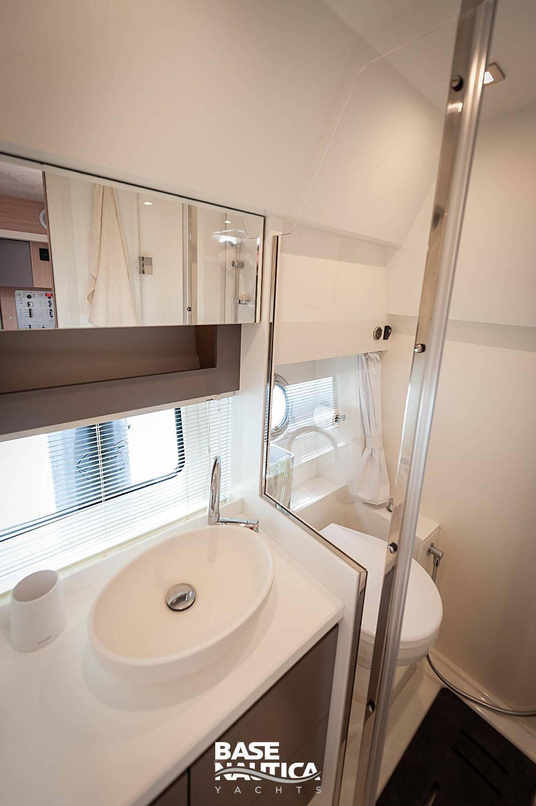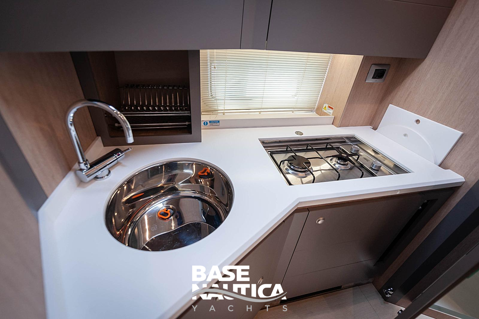 CABINA ARMATORIALE A PRUA, CABINA OSPITI DOPPIA A POPPA, AMPIO BAGNO CON BOX DOCCIA, DINETTE TRASFORMABILE IN LETTO E CUCINA COMPLETA CON FRGIGORIFERO E PIANO COTTURA.
