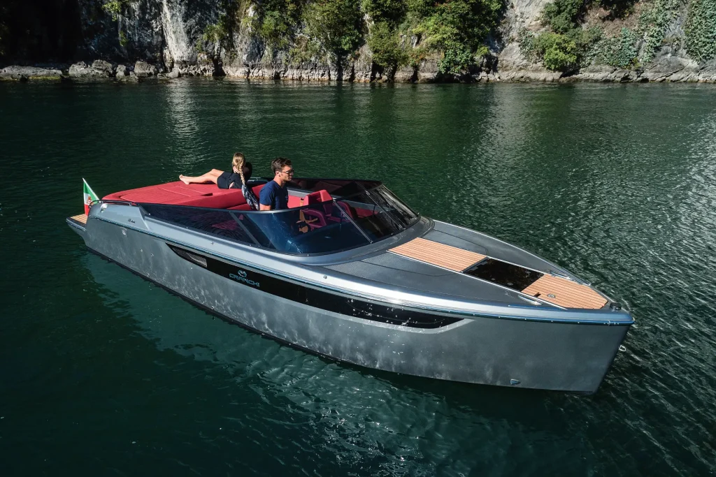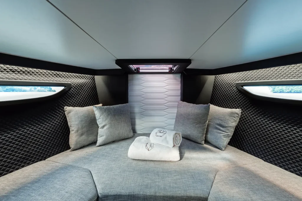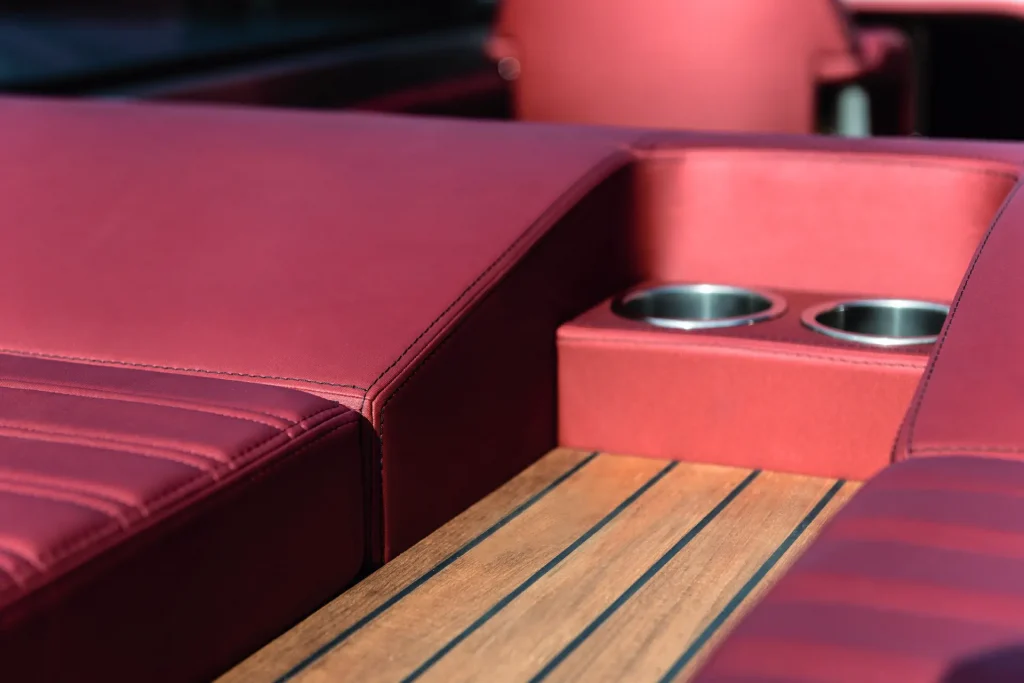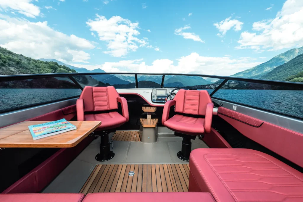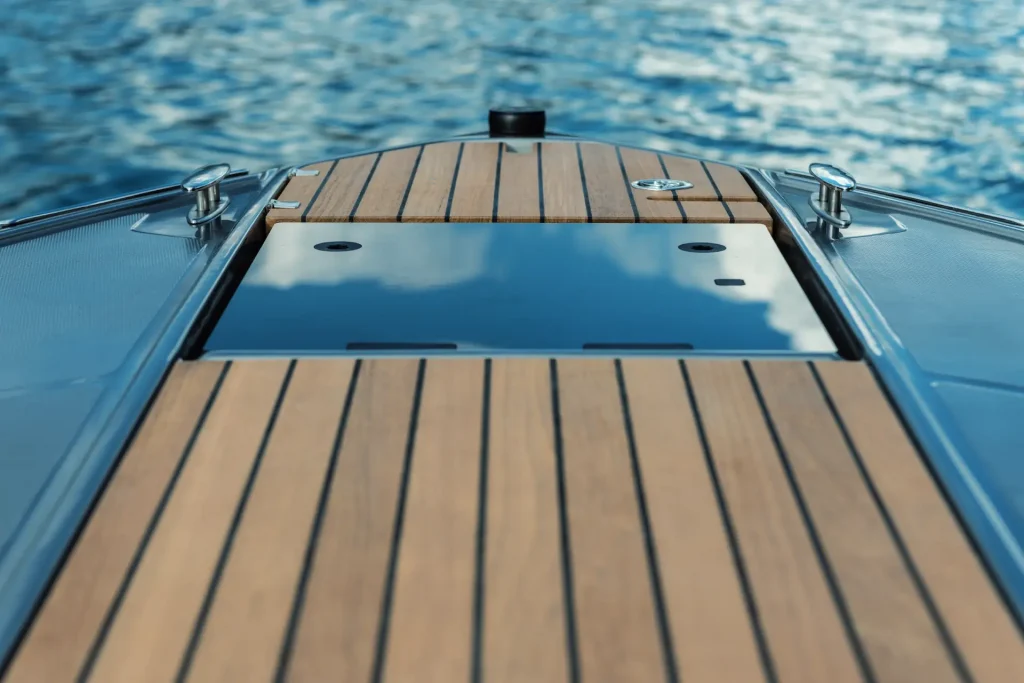 La versatilità di questo modello è straordinaria: può essere sia un day cruiser sia un luxury tender. Il ponte di prua in teak, chiaro omaggio alla tradizione delle barche in legno, si unisce armoniosamente alla plancetta di poppa rivestita di teak, creando un connubio visivamente accattivante. Soluzioni innovative, come il tendalino a scomparsa per ombreggiare il pozzetto e il grande prendisole a poppa, garantiscono comfort e relax in ogni momento.