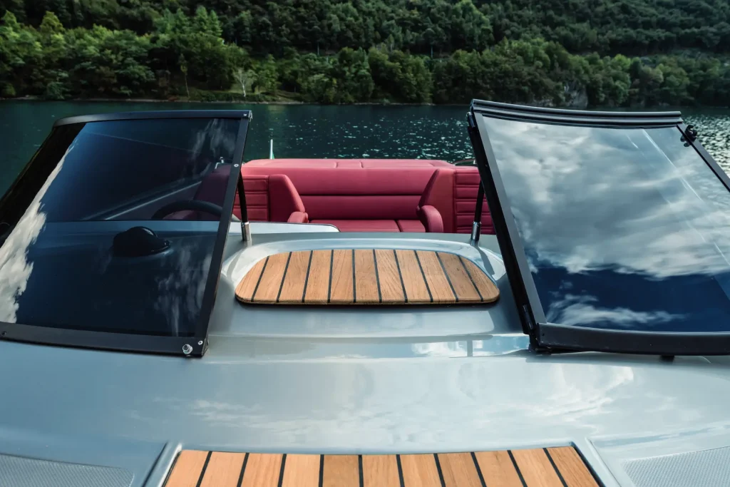 Il parabrezza avvolgente e a tutto baglio, con un varco centrale, non solo protegge il pilota e i passeggeri, ma offre anche un accesso pratico al ponte di prua.