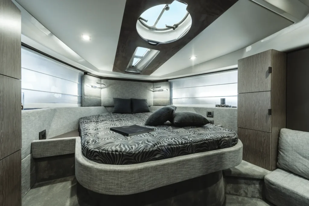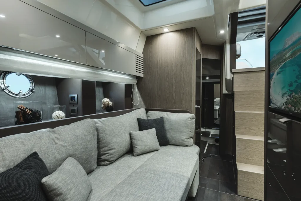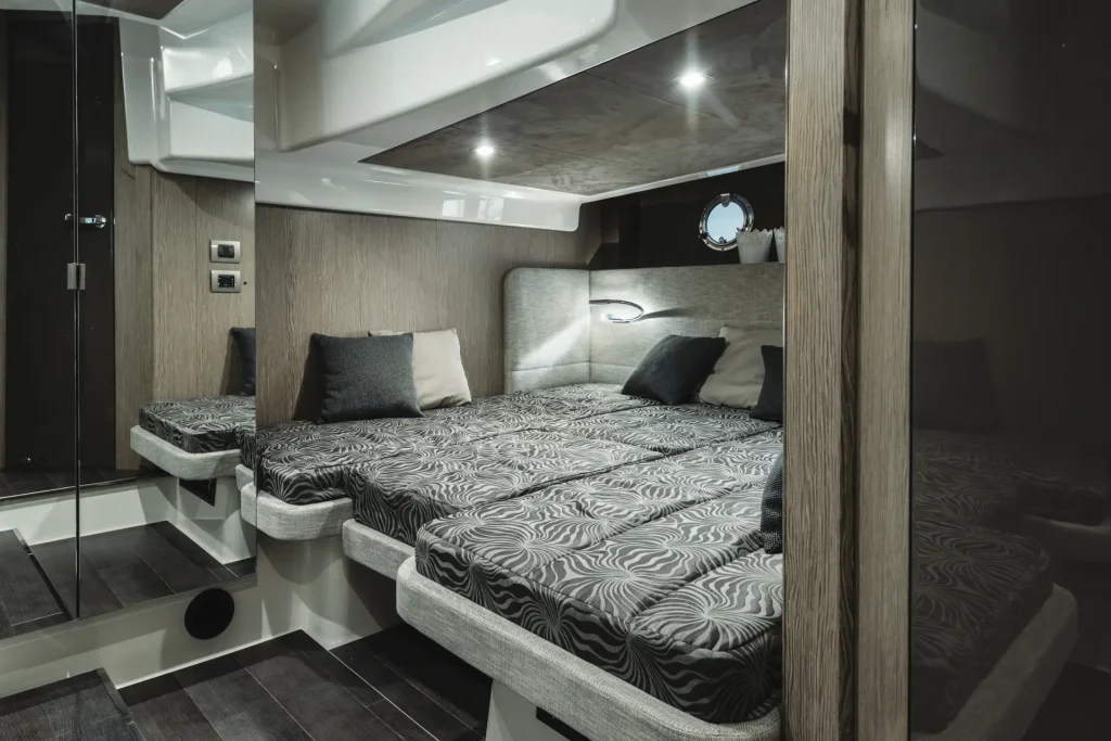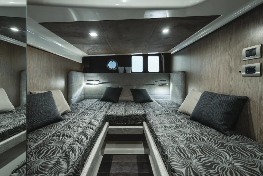 Il recente restyling ideato da Christian Grande ha conferito agli interni del Cranchi M44 HT un’eleganza ancora più raffinata, caratterizzata da uno stile contemporaneo che unisce funzionalità ed estetica. Gli spazi interni sono ben organizzati, ottimizzando al massimo l’utilizzo dei volumi disponibili. La cabina di poppa accoglie comodamente tre posti letto, mentre quella di prua offre molto spazio non solo per muoversi intorno al letto, ma anche per riporre comodamente il bagaglio. Nel cuore dell’imbarcazione troverete una cucina completa, ideale per le vostre cene a bordo.