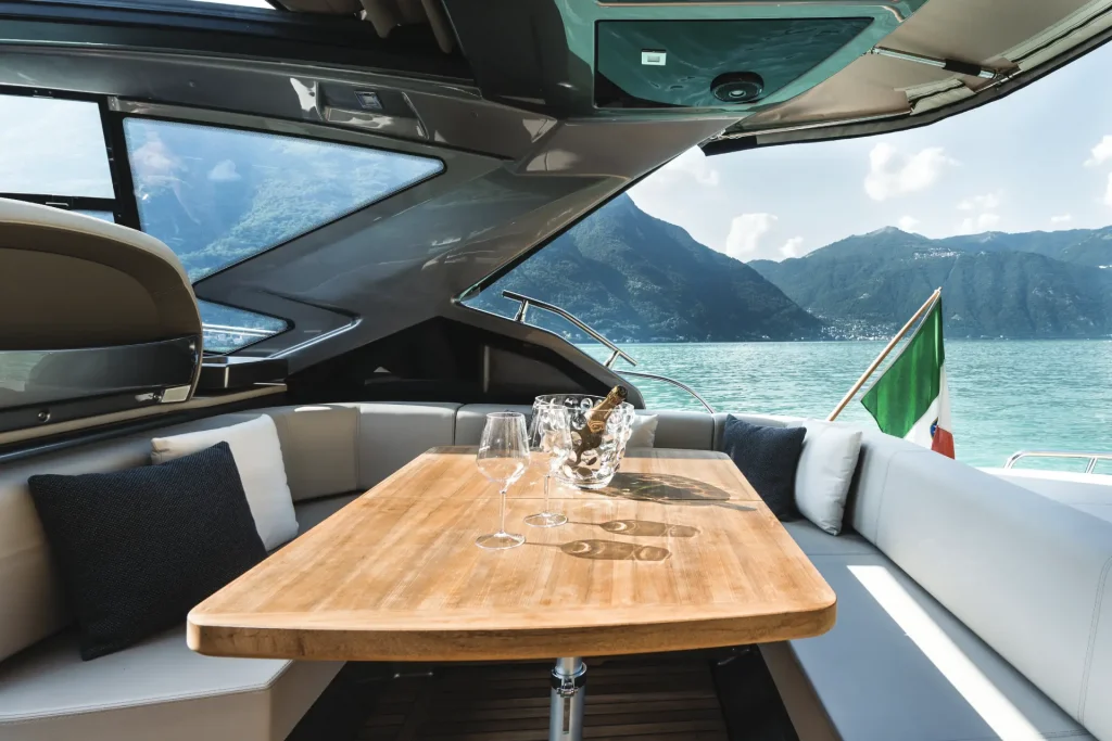 Il soft top garantisce protezione ottimale al pozzetto, offrendo la possibilità in ogni momento di trasformare questo yacht in un vero e proprio open. Nei momenti in cui si desidera maggior riparo, il buon isolamento del tettuccio crea un ambiente chiuso e confortevole. Il top copre la dinette posizionata a pruavia, mentre sul lato sinistro troviamo il pratico mobile cucina e la chaise longue che sfrutta l’apertura del tetto per momenti di relax sotto il sole. D’impatto è la disposizione degli strumenti sulla plancia di comando, che armonizza strumenti analogici con monitor digitali, conferendo un tocco di fascino alla navigazione.