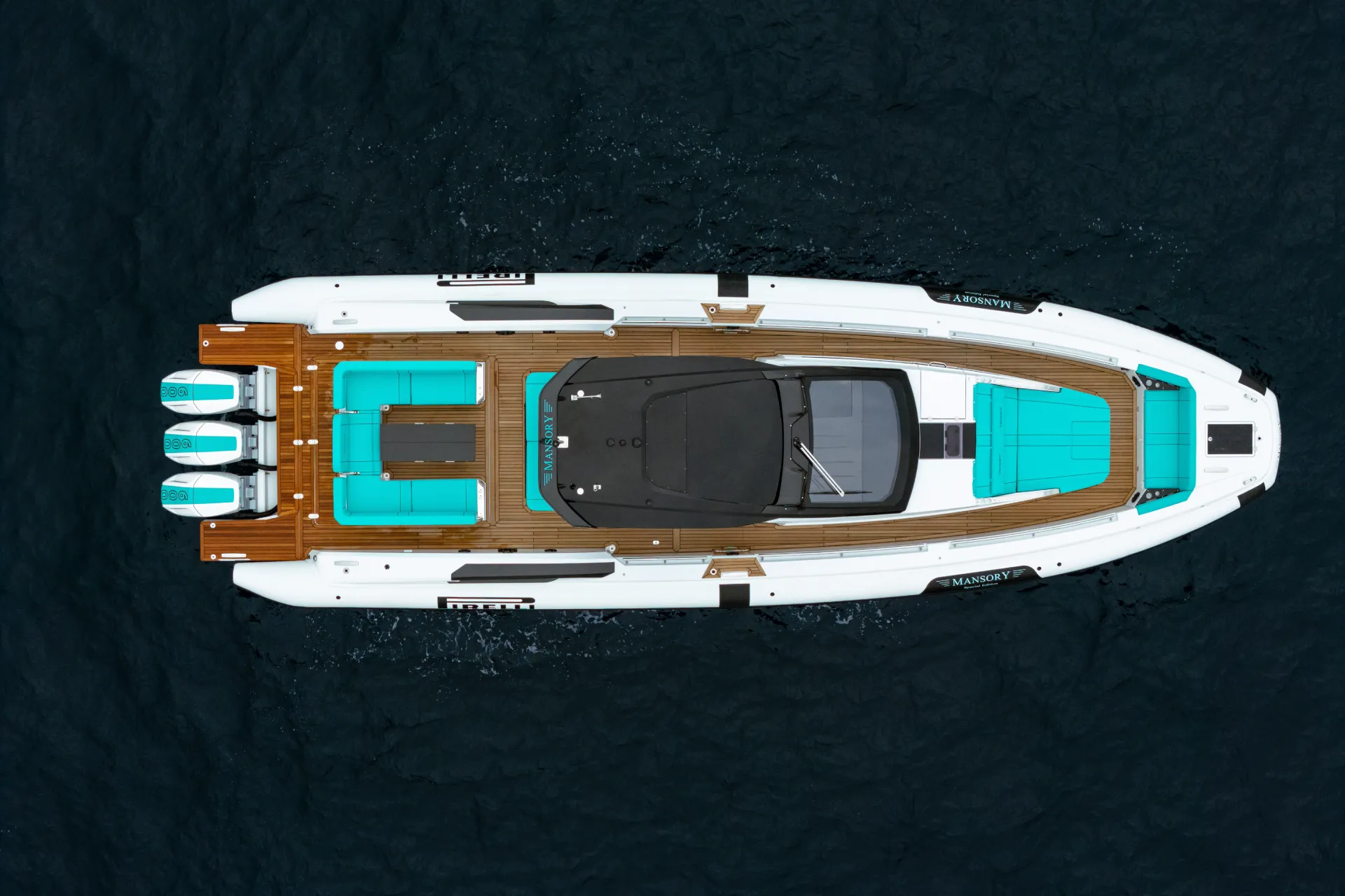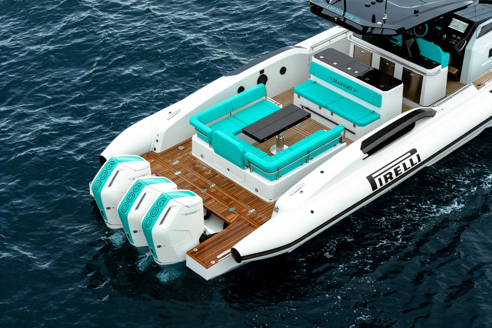 Il Pirelli 50 Mansory Edition rappresenta l’ammiraglia della gamma Pirelli personalizzata dal prestigioso preparatore tedesco Mansory, specializzato in auto di lusso. Lunga 15,2 metri e larga 4,70 metri, questa special edition monta una tripla motorizzazione V12 Mercury da 600 HP ciascuno per un totale di 1800 cavalli. La plancia di comando è stata completamente ridisegnata con display del cruscotto e pannelli pulsanti restyling per un’esperienza di guida senza precedenti. L’imbarcazione si distingue per l’estensivo uso di fibra di carbonio a vista in oltre 15 componenti: spoiler aerodinamico del tetto, pannello di controllo del cockpit, volante e joystick in pelle e carbonio, tavolo pieghevole posteriore, portabicchieri, copertura altoparlanti e pannelli murali personalizzati. Le cuscinerie interne ed esterne sono completamente personalizzate da Mansory con i loghi del brand, mentre la cabina dell’armatore a prua e la cabina doppia presentano design distintivo. Dettagli premium includono fari integrati a luce stellare, copertura del pulsante di avviamento in stile aeroplano e motori verniciati su misura, per un totale che può ospitare 14 persone con serbatoi da 2000 litri di carburante e 285 litri d’acqua.