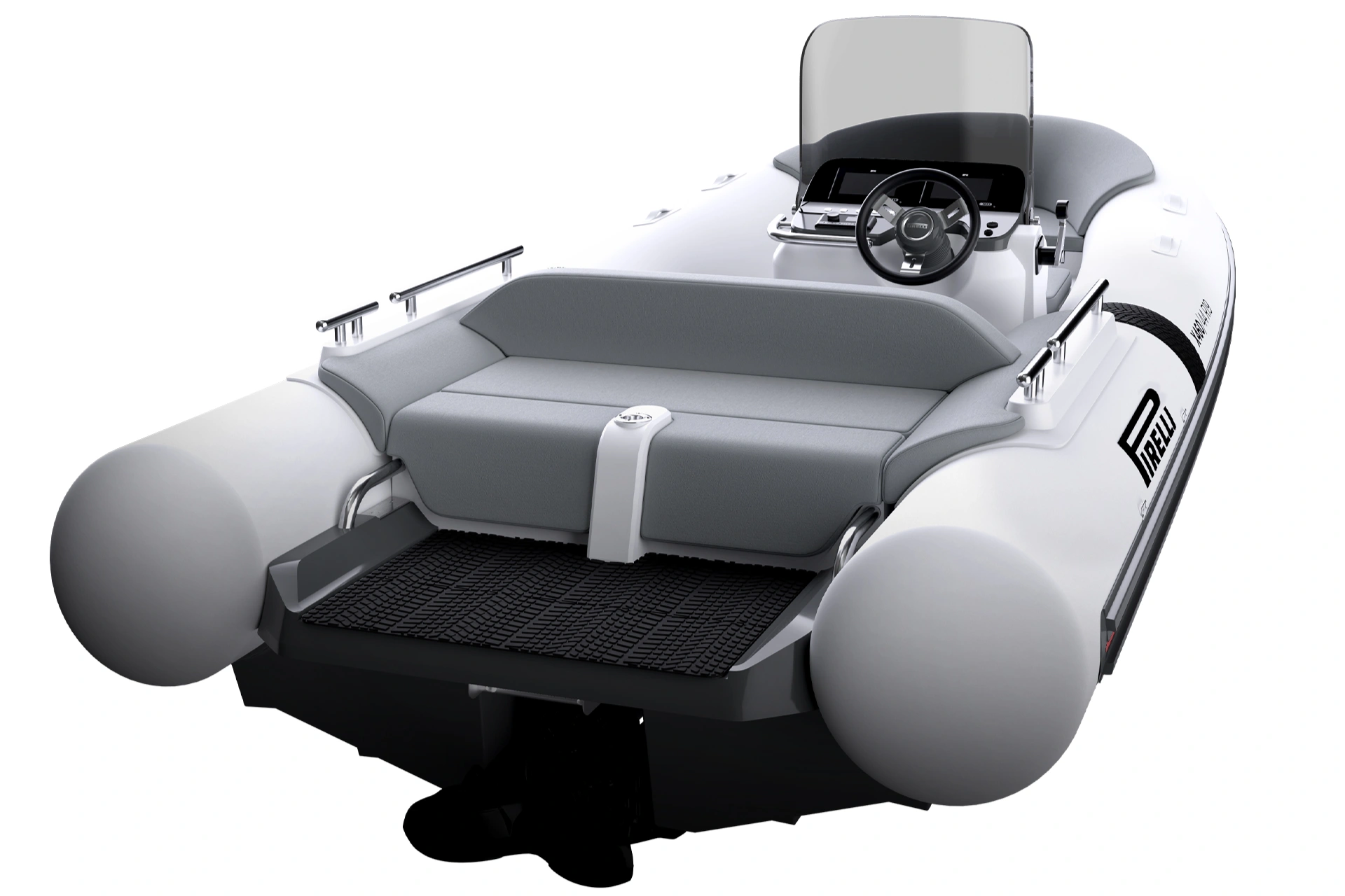 La propulsione JET è il cuore del carattere sportivo del tender Pirelli: accelerazione pronta, controllo preciso e manovrabilità fluida anche negli spazi più stretti. La carena V Hull e il bilanciamento dei pesi rendono la guida stabile e sicura, con virate rapide e una navigazione dinamica, ideale sia per trasferimenti veloci sia per divertimento in rada.