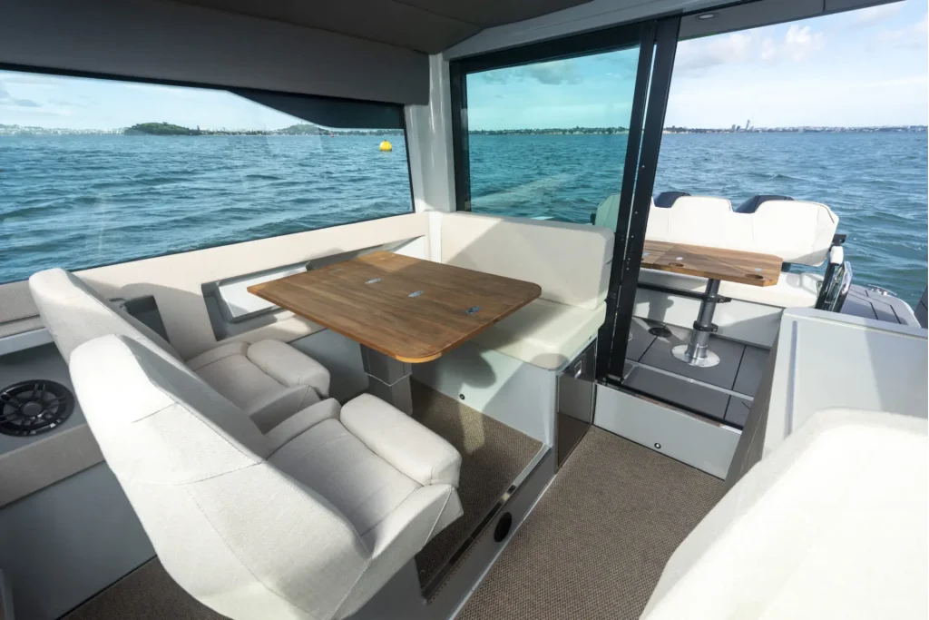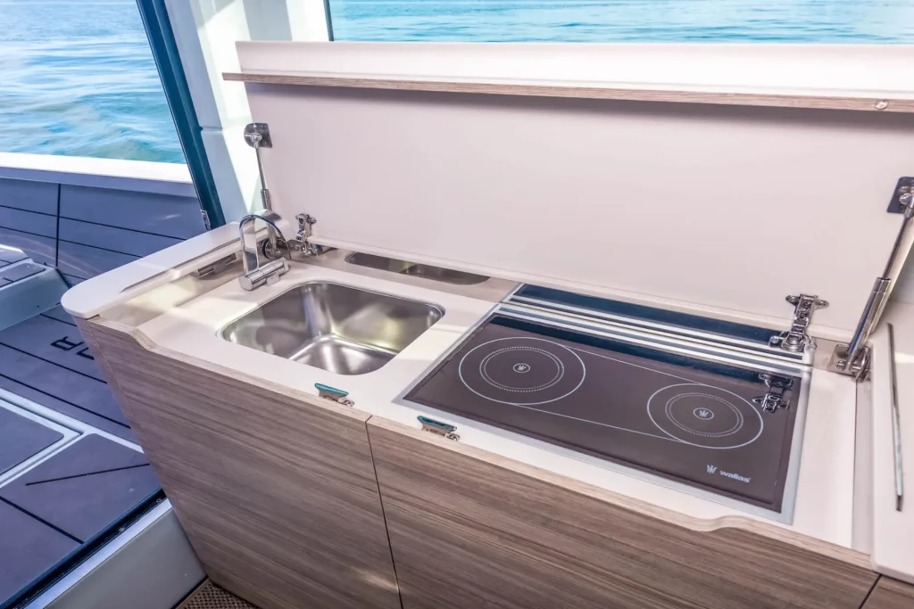 Benvenuti nel cuore pulsante della cabina: il wetbar di dimensioni generose, dove la cena si trasforma in un'esperienza magica. Con un wetbar spazioso, sistema di acqua dolce e una zona pranzo accogliente, questo è il luogo dove si può godere della compagnia degli amici. Muoversi a bordo non è mai stato così facile grazie a una terrazza e a una zona di prua ben progettate.