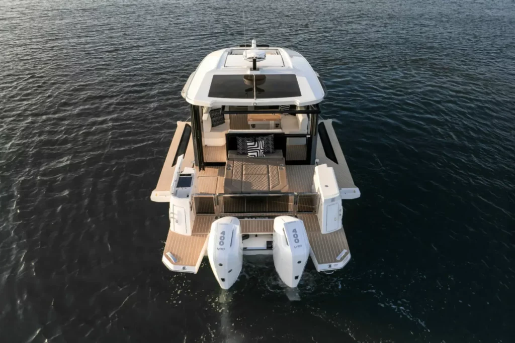 Dietro la postazione di comando si apre un elegante living con una dinette a L, un divano a poppa e un secondo divanetto sul lato di dritta, dove si trova anche il mobile cucina. Il pozzetto offre ampio spazio calpestabile e un confortevole prendisole parzialmente protetto dall’hard top. Spostandosi verso prua, si trova una seconda dinette, ideale per godersi il panorama. Lo specchio di poppa trasparente garantisce la sicurezza durante la navigazione, mantenendo una visuale ininterrotta verso il mare, perfetta per rilassarsi sul prendisole in totale serenità. A contribuire all'aumento dello spazio utile in coperta vi sono le sezioni apribili delle murate, sapientemente integrate in corrispondenza del salone. Grazie alle vetrate laterali scorrevoli, si crea un ambiente completamente aperto verso il mare.