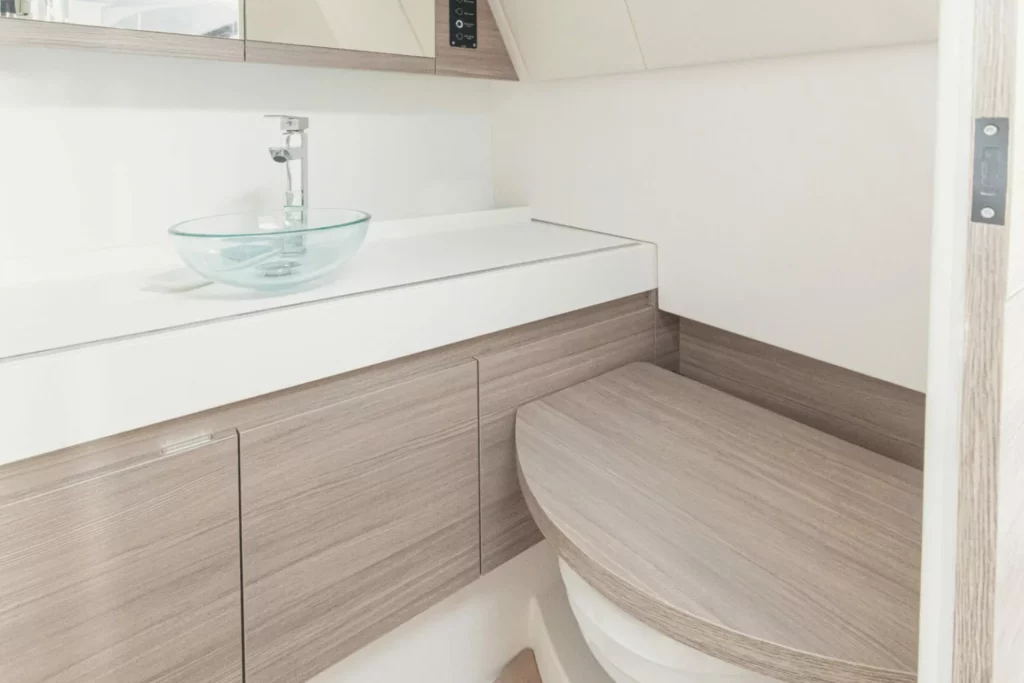 Sottocoperta, il Saxdor 400 GTC offre due eleganti cabine matrimoniali, progettate seguendo un layout classico che posiziona la spaziosa cabina armatoriale a prua e la cabina ospiti a poppa, in un'area separata e dotata di un accesso privato. Per chi cerca ulteriore versatilità, è possibile aggiungere una terza cuccetta, ideale per i più piccoli. Presente un bagno nell'area armatoriale.