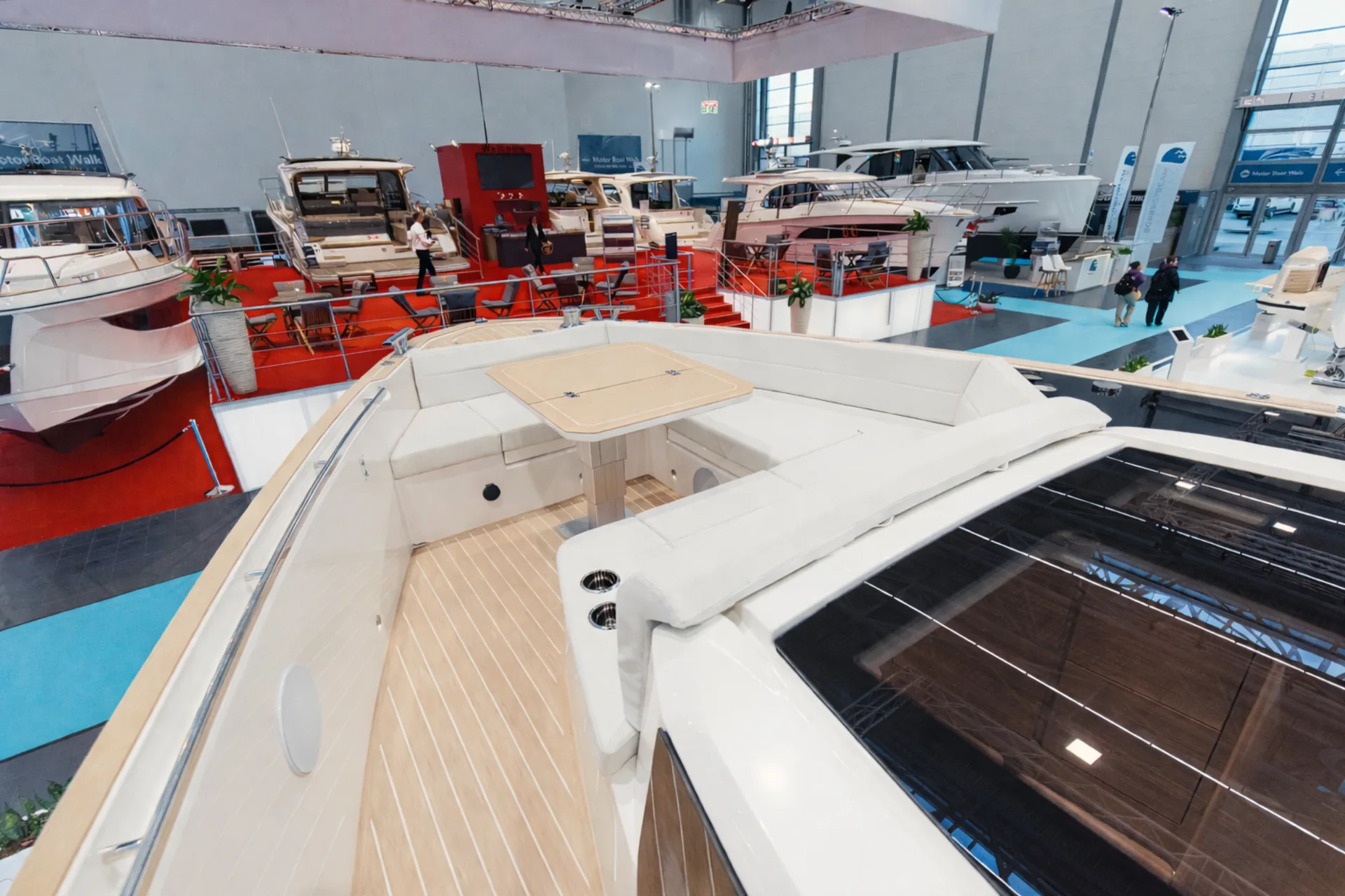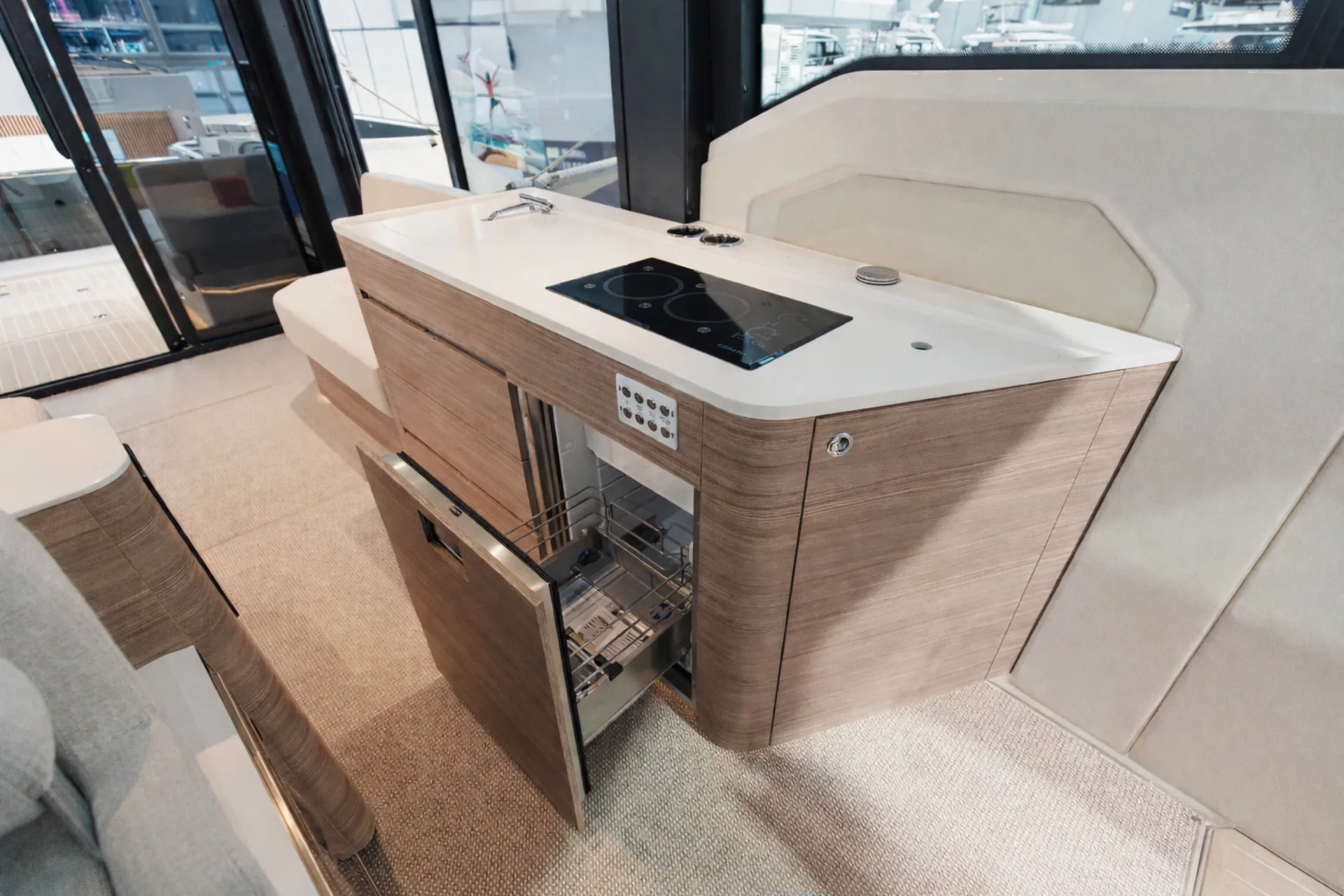 Plancia con cruscotto scolpito, configurabile fino a tre display Simrad da 16″ per una navigazione sempre sotto controllo.